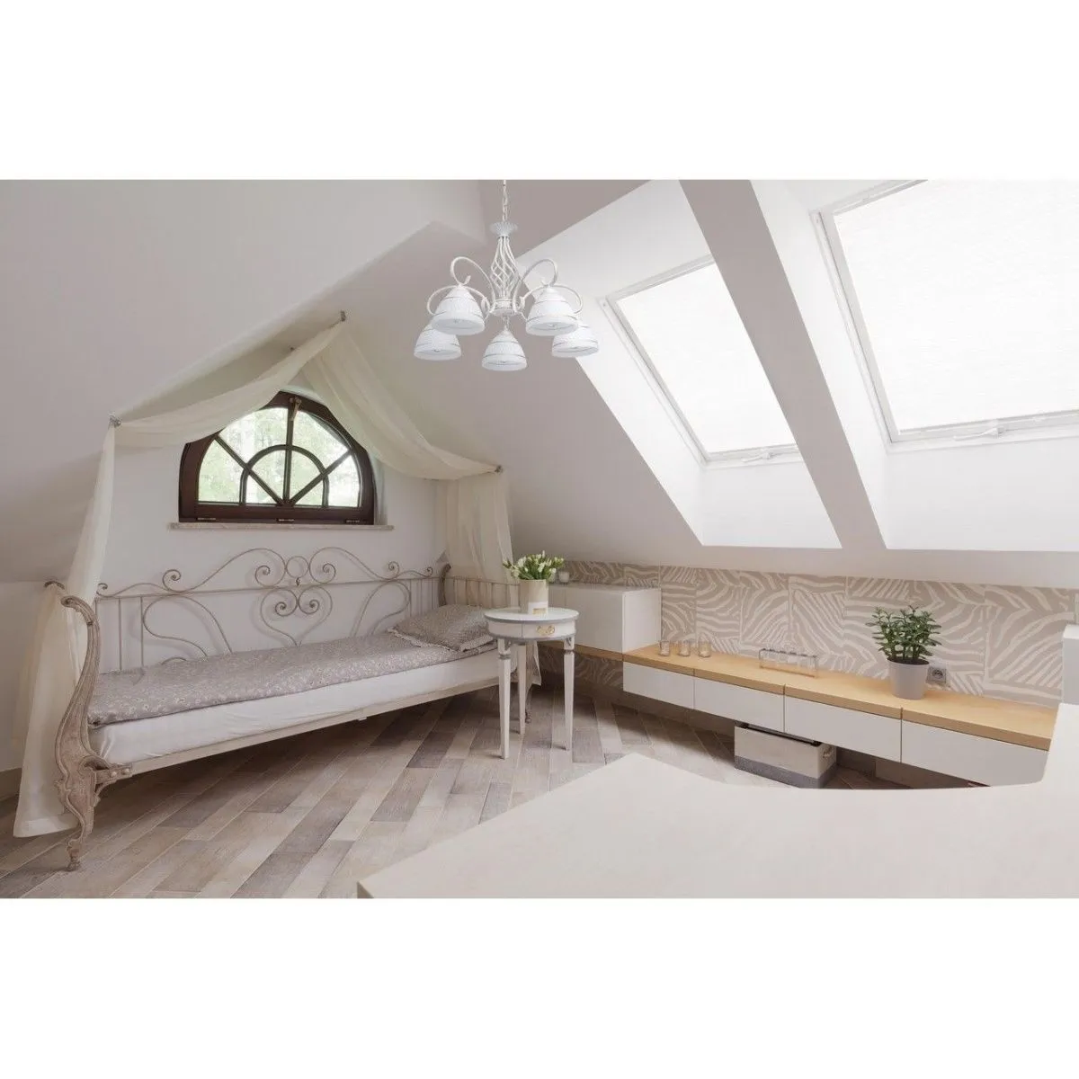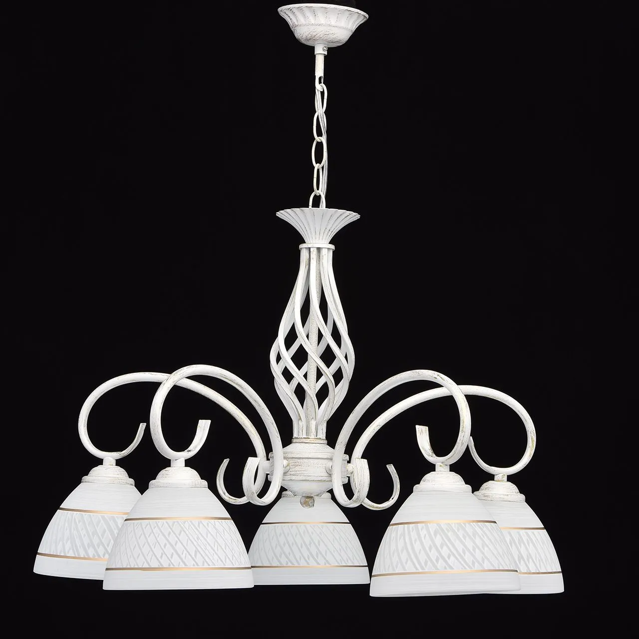 Металлическое основание, окрашенное в белый цвет с золотистой патиной . Плафоны из стекла, отлитого