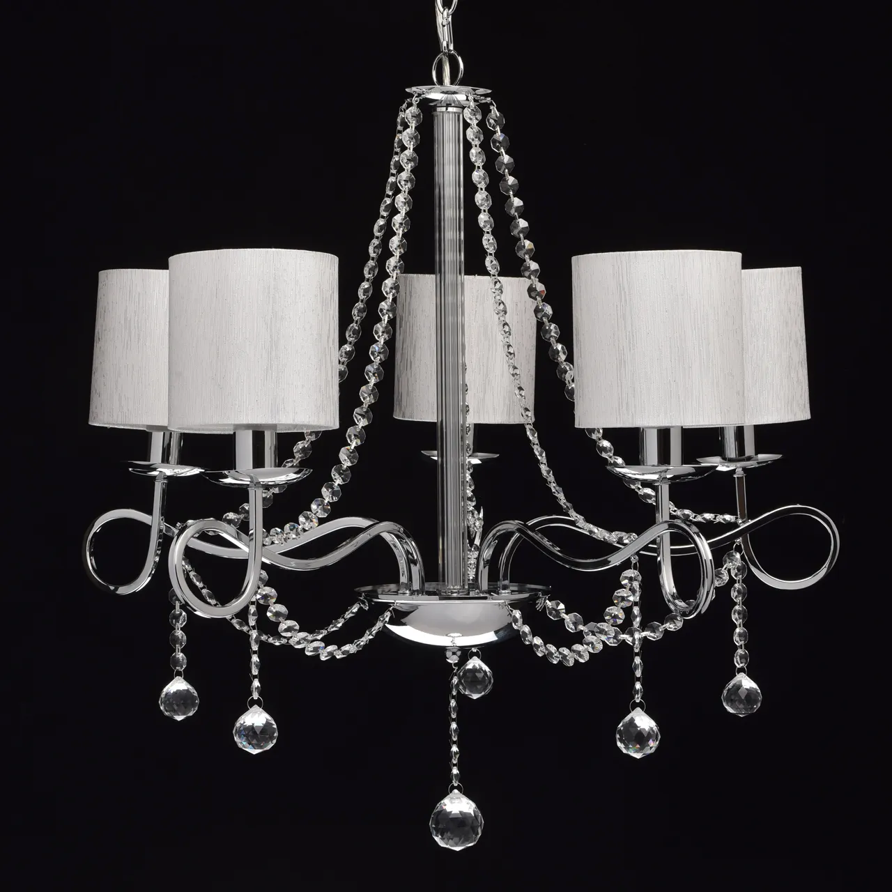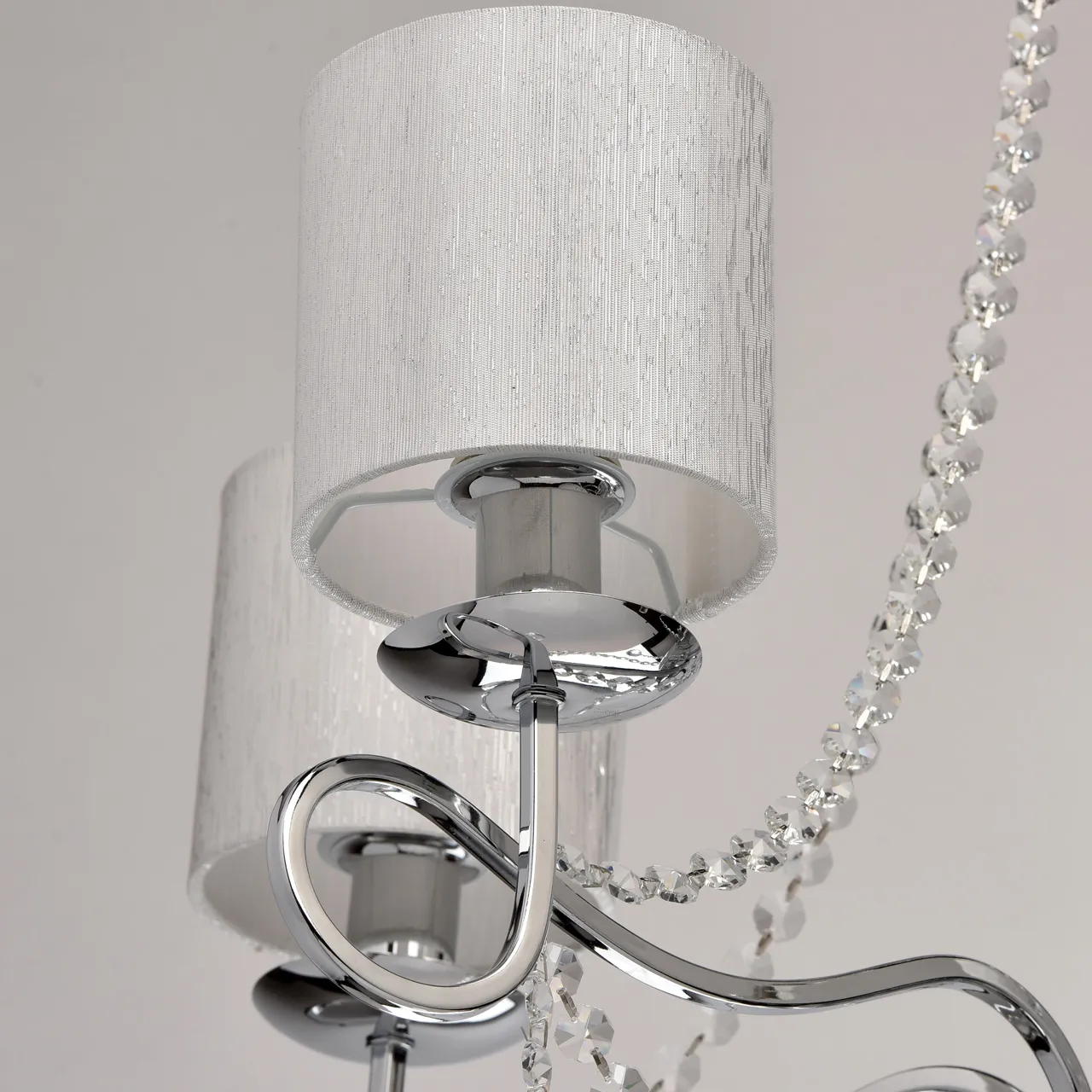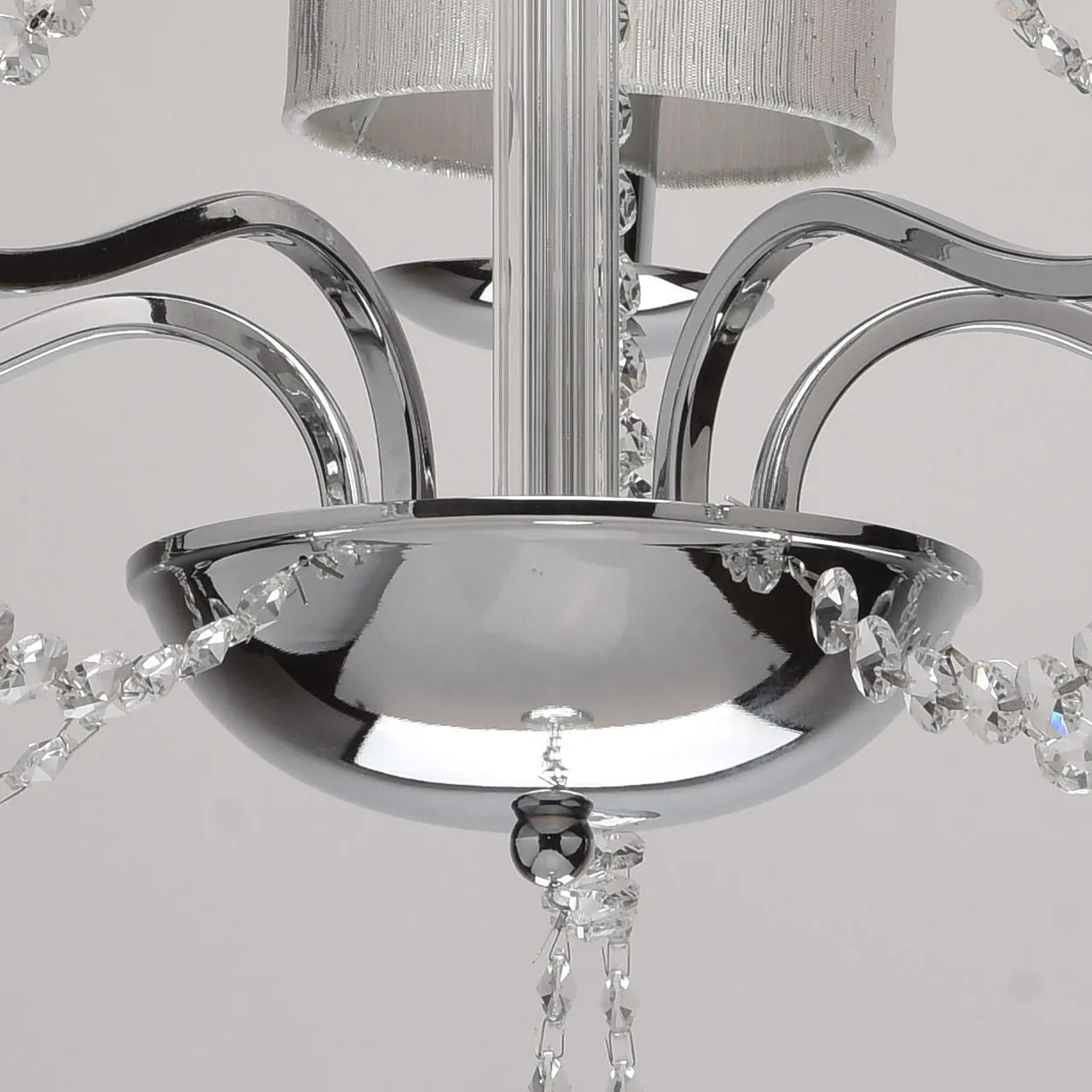 Металлическое основание цвета хрома. Плафоны: парча серебрянного цвета. Декор - хрусталь